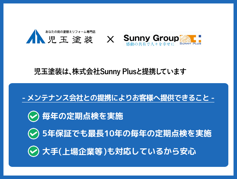 児玉塗装の保証や定期点検は、お客様へのメリットを考え、株式会社SunnyPlusと提携しています。株式会社SunnyPlusと提携によりお客様へ提供できることは以下の通りです。